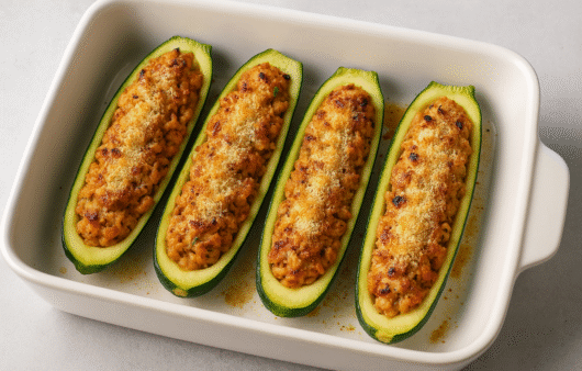 Abobrinhas recheadas com carne de frango temperada e gratinadas com queijo, uma opção saborosa e leve.