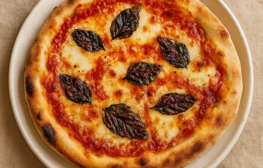 Pizza clássica e econômica com molho de tomate, queijo e manjericão fresco, leve e perfeita para refeições rápidas e saborosas.