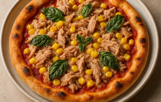 Pizza prática e econômica com atum e milho, saborosa e leve, ideal para refeições rápidas e encontros com amigos ou família.