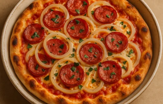 Pizza clássica e econômica com calabresa e cebola, suculenta e perfeita para encontros em família ou com amigos.