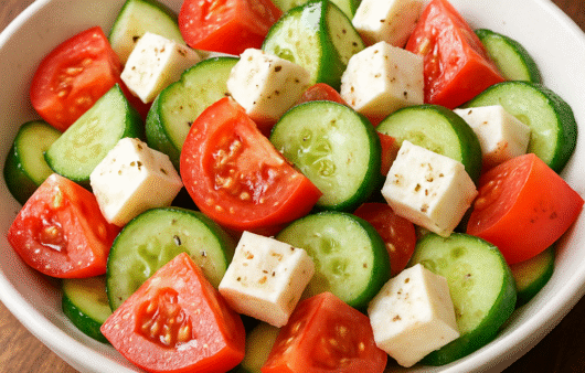 Salada fresca e mediterrânea com tomate, pepino e queijo branco, leve, nutritiva e econômica, ideal para refeições rápidas e saborosas.