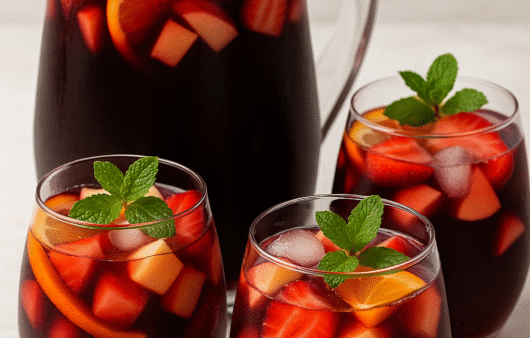 Bebida leve e refrescante com suco de uva e frutas frescas, servida em copos de 250 ml, perfeita para brindar de forma elegante e colorida em qualquer ocasião especial.