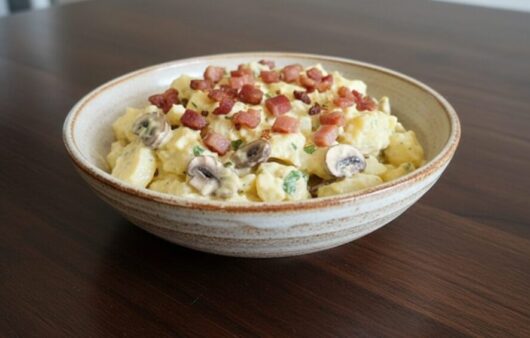 Salada de batata quente e substanciosa, feita com bacon, cogumelos e um vinagrete de mostarda Dijon. Perfeita para uma refeição principal.