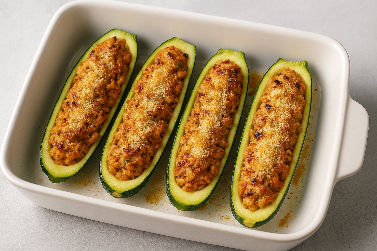 Esta abobrinha recheada é uma opção leve, nutritiva e econômica que transforma ingredientes simples em um prato cheio de sabor. A combinação da carne moída de frango com temperos como páprica e canela cria um recheio aromático que percorre cada parte da abobrinha, e a crocância do topo gratinado com queijo dá um toque irresistível. Uma excelente escolha para um almoço prático que impressiona sem complicação.