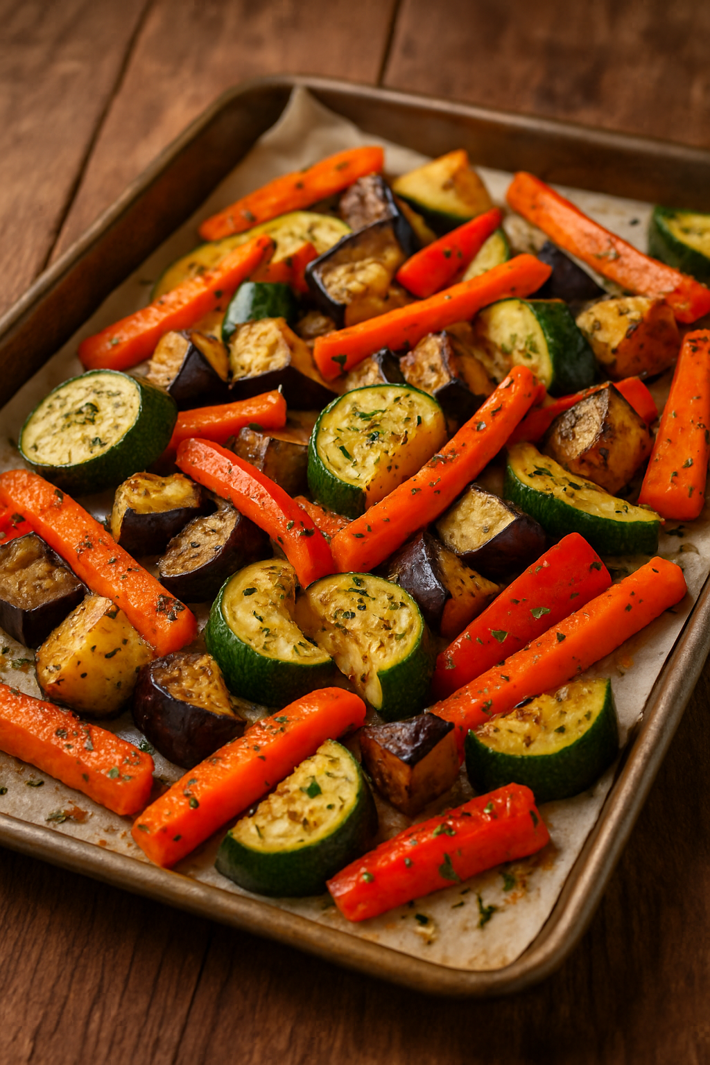 Esta receita de legumes assados com ervas é uma explosão de cores, aromas e sabores. Abobrinha, berinjela, cenoura e pimentão se combinam em uma mistura crocante por fora e macia por dentro, com o sabor realçado pelo azeite e temperos simples como sal, pimenta-do-reino e ervas frescas ou secas. É uma receita que transforma ingredientes simples em um prato sofisticado, perfeito para acompanhar carnes, peixes ou ser servido como prato principal leve.