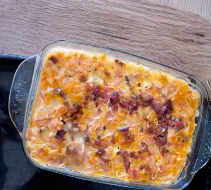 Em uma travessa grande, misture o macarrão cozido al dente com a maior parte do molho, deixando um pouco de molho para cobrir por cima. Adicione o presunto picado e metade do bacon crocante reservado. Misture bem para incorporar.
