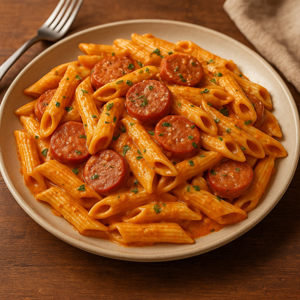 Essa macarronada é daquelas receitas simples que ganham um toque especial com ingredientes baratos e cheios de sabor. A calabresa dourada no começo da receita solta um aroma delicioso, e o molho branco com um toque de tomate faz o prato ficar cremoso sem pesar.