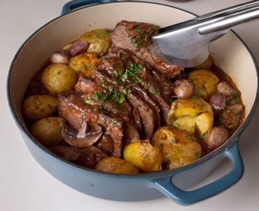 A maminha é temperada com ervas e alho, assada no ponto para ficar suculenta, e acompanhada de batatinhas bolinha amassadas e gratinadas. O molho é a estrela, feito com vinho tinto e caldo de carne para garantir um sabor profundo e encorpado.