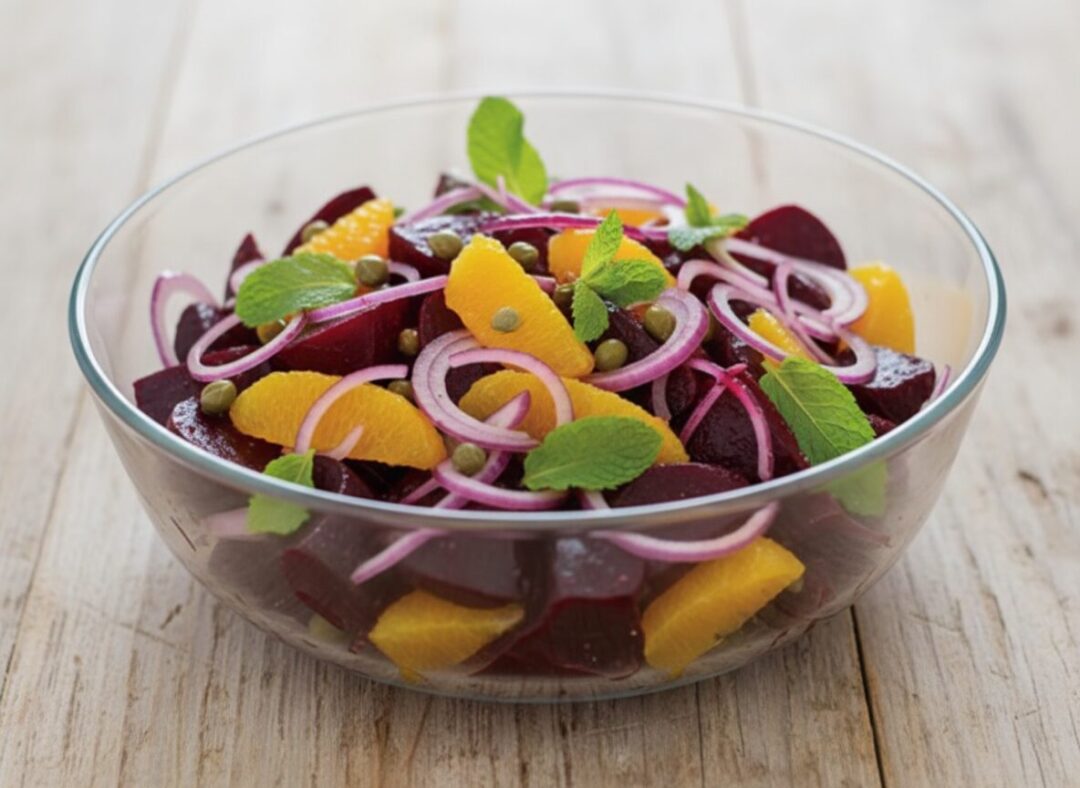 Esta é uma salada que impressiona tanto pela cor vibrante quanto pelo sabor agridoce e refrescante. A combinação da doçura terrosa da beterraba, que é assada para concentrar o sabor, com a acidez da laranja resulta em um acompanhamento delicioso.