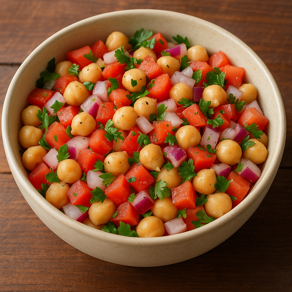Esta salada de grão-de-bico com tomate e cebola é nutritiva, saborosa e econômica. O grão-de-bico fornece proteínas vegetais e fibras, enquanto o tomate e a cebola frescos adicionam suculência e sabor natural. É uma opção leve para o almoço ou jantar, podendo ser servida como prato principal ou acompanhamento.