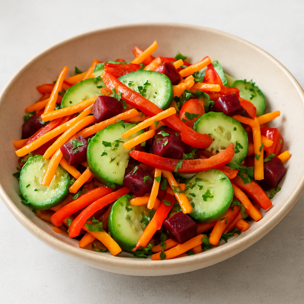 A salada de legumes colorida é fresca, vibrante e nutritiva. Cenoura, beterraba, pepino e pimentão se combinam em um prato crocante e cheio de cores, tornando cada garfada uma explosão de textura e sabor. Temperada com azeite, limão e ervas frescas, é uma opção leve, saudável e prática para o dia a dia.