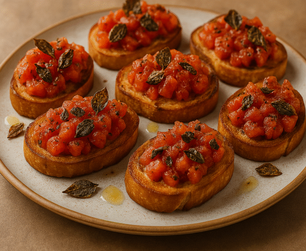 Entrada leve e saborosa com pão crocante, tomate fresco temperado e manjericão, perfeita para abrir