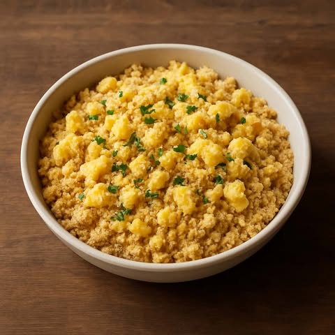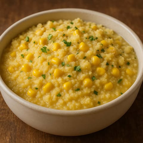 Farofa cremosa de milho com toque de manteiga, macia e saborosa, perfeita para complementar carnes