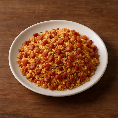 Farofa macia e saborosa com ovos e cebola dourada, ideal para completar o churrasco com