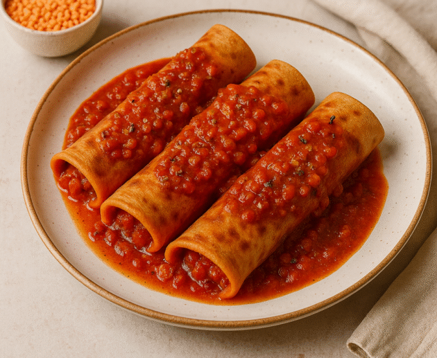 Versão sem glúten feita com lentilha e coberta por um molho caseiro leve e saboroso.