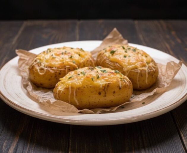 Batata inglesa grande recheada com uma mistura cremosa de queijo mussarela, requeijão sabor cheddar, alho