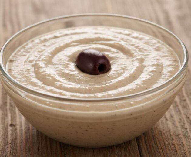 Patê fácil e rápido, feito com azeitonas, alho e maionese. É um acompanhamento cremoso e