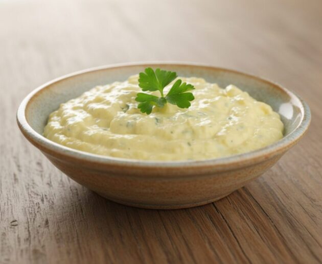Patê de alho caseiro e cremoso, feito com leite e alho batidos no liquidificador. É