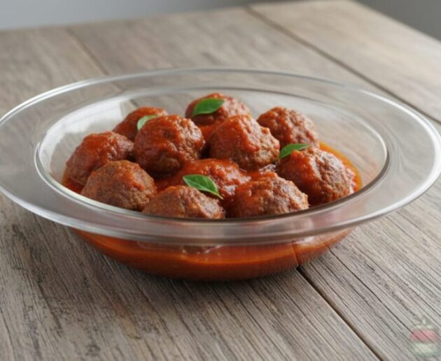 Almôndegas caseiras, temperadas e seladas, cozidas em um molho de tomate fresco. Ficam macias e