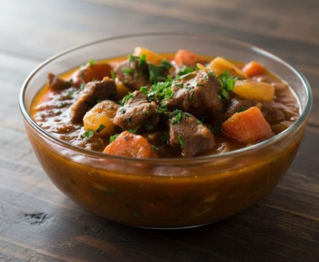 Carne moída cozida com batatas e temperos, formando um prato saboroso e substancioso. Receita simples