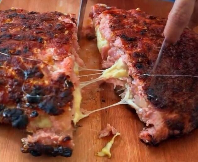 Uma manta de linguiça suculenta recheada com queijos e grelhada sob pressão para ficar crocante