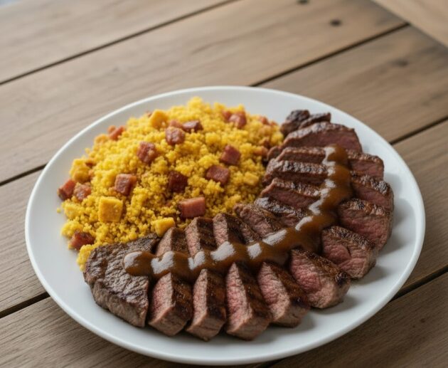 Fraldinha suculenta cozida na cerveja que fica macia e desmanchando, servida com uma farofa crocante