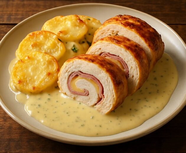 Rocambole de frango recheado com presunto e queijo, suculento e econômico, servido com batatas gratinadas