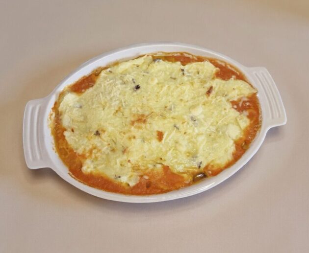 Filé de tilápia assado sob um molho de tomate caseiro e coberto com um purê