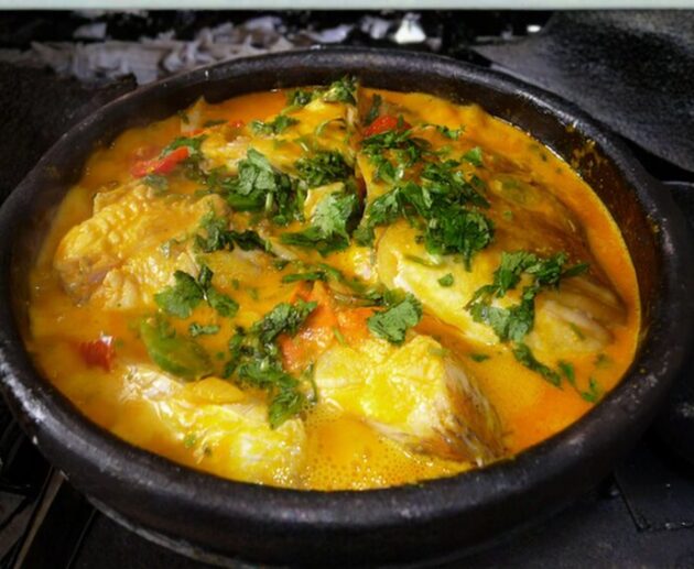 Uma moqueca de peixe cação rápida, colorida e aromática, feita com leite de coco e