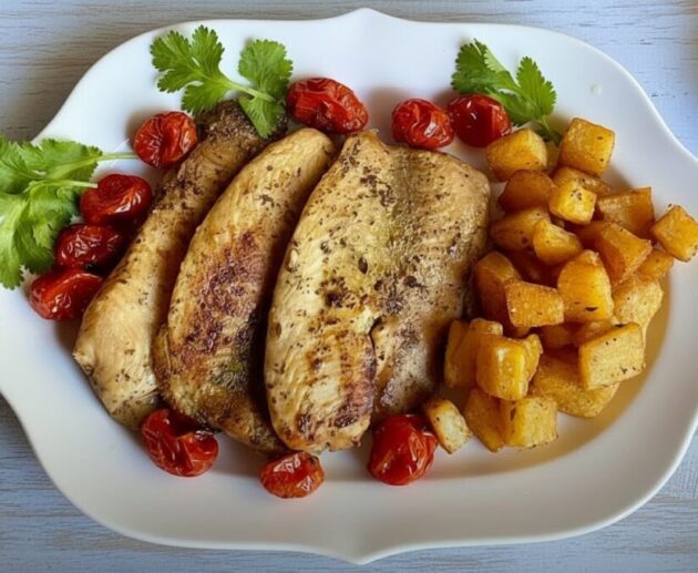 Filé de tilápia suculento, marinado em um molho fresco de coentro e vinho branco, assado