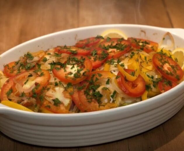 Um prato leve e saudável de filé de peixe assado com vegetais frescos e temperos