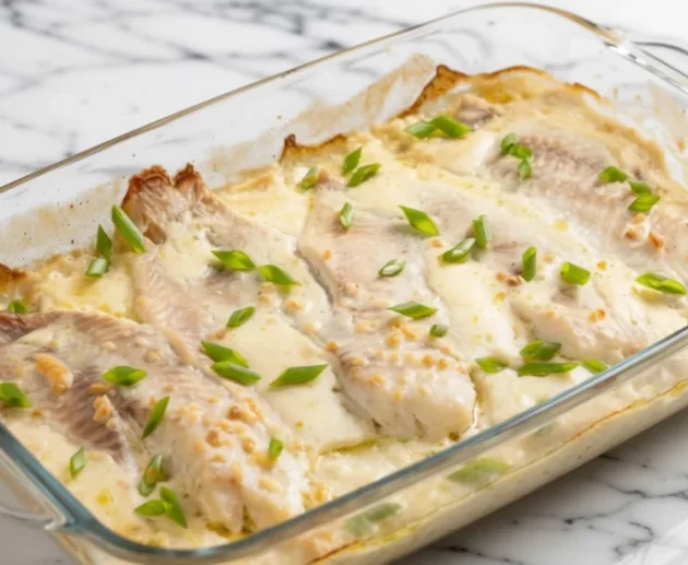 Filé de tilápia assado em um creme saboroso feito com sopa de cebola, leite e