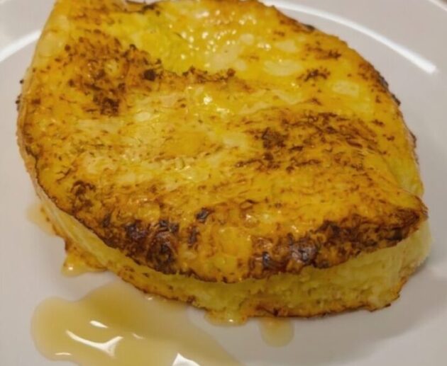 Suflê delicioso e versátil à base de ovos, alho poró salteado e palmito, assemelhando-se ao