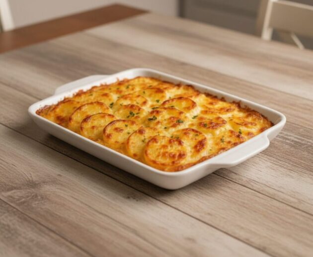 Batata em fatias finas assada em um molho cremoso de creme de leite e leite,