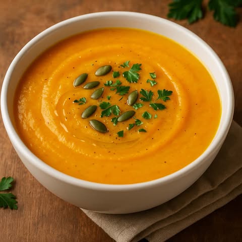 Sopa cremosa e nutritiva de abóbora e cenoura, com temperos simples e aroma irresistível, perfeita