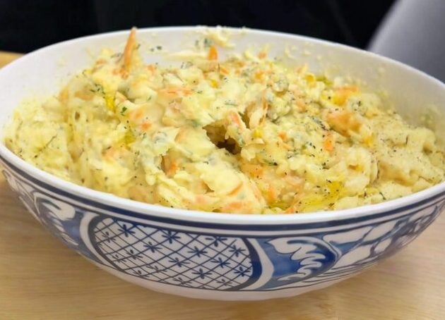 Maionese caseira e cremosa, feita com batatas cozidas, cenoura, milho, ervilha e o toque especial