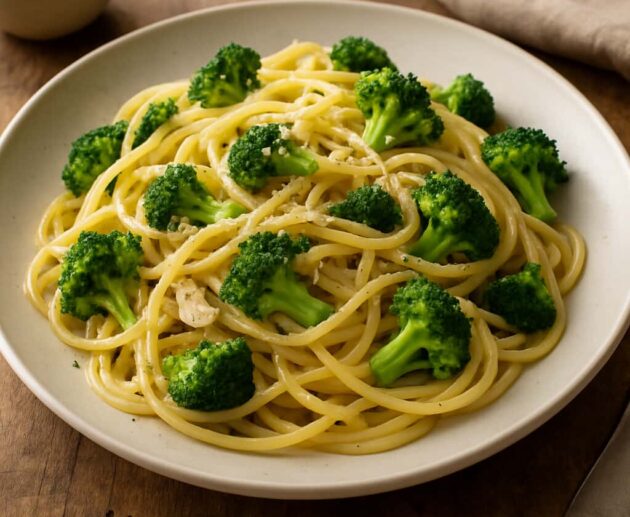 Espaguete leve e nutritivo com alho dourado, azeite e brócolis crocante, pronto em minutos e