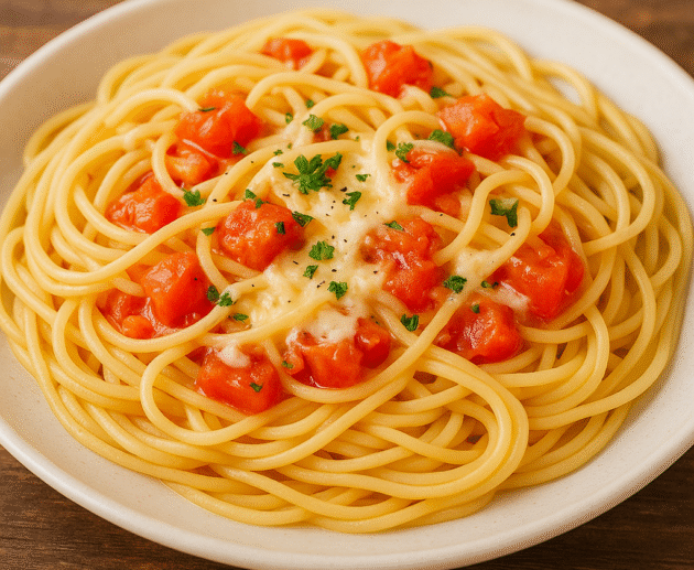 Refeição simples e rápida com macarrão macio, tomates frescos e queijo derretido, prática, econômica e