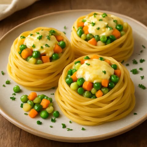 Ninhos de macarrão recheados com legumes frescos e queijo derretido, nutritivos, coloridos e fáceis de