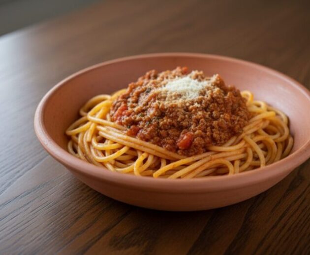 Macarrão tipo Linguine com um molho de carne moída suculento, rico em temperos e finalizado