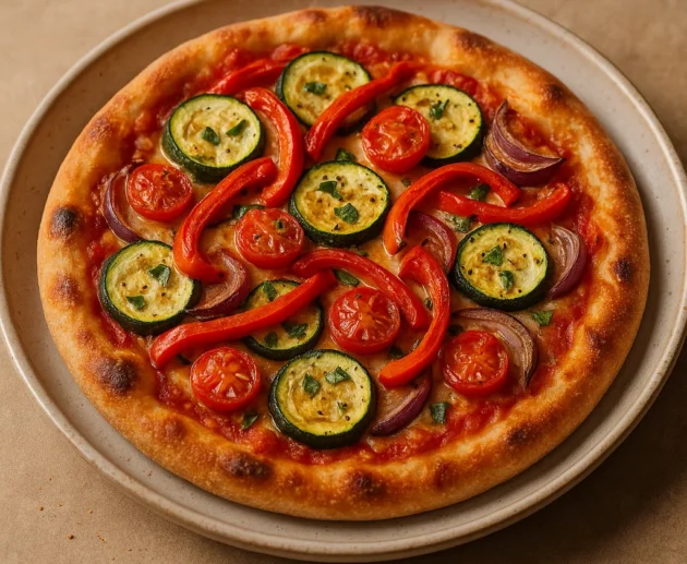 Pizza leve e econômica com legumes assados e queijo, prática e colorida, perfeita para refeições