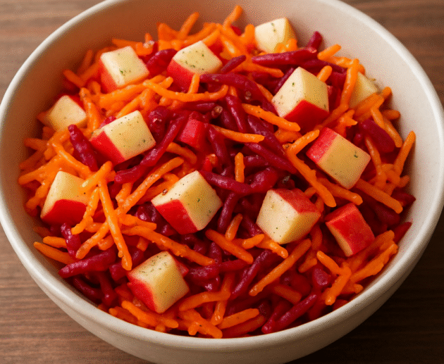 Salada doce e crocante com cenoura, beterraba e maçã, colorida e nutritiva, ideal para refeições