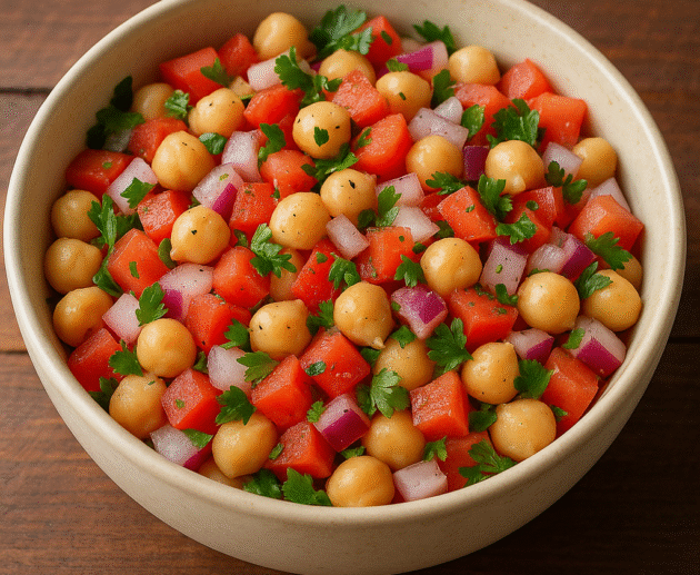 Salada prática e nutritiva com grão-de-bico, tomate e cebola, leve e econômica, perfeita para refeições