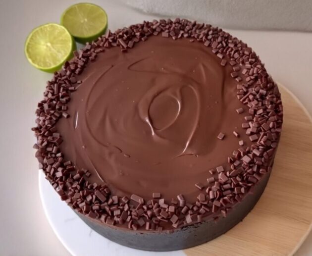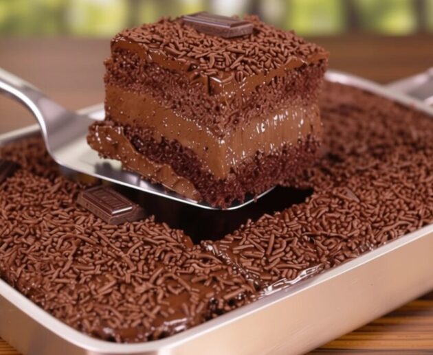Um bolo de chocolate que tem massa, calda e recheio feitos no liquidificador, resultando em
