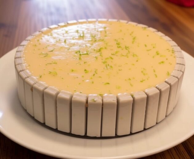 Uma torta gelada de limão, sem forno, com creme de Ninho e cobertura, cercada por