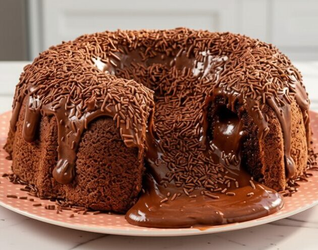 Um bolo de chocolate fofinho com um centro generoso de brigadeiro cremoso que escorre ao
