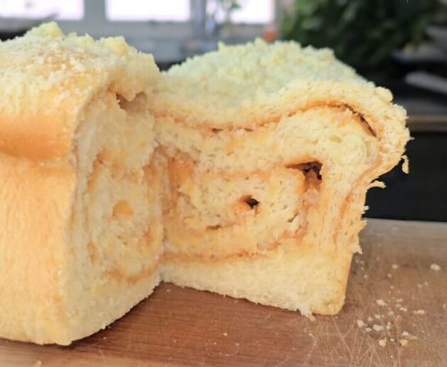 Cuca fofinha e leve, recheada com um blend de doce de leite e requeijão cremoso,