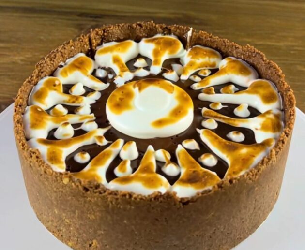 Uma torta que combina base crocante de biscoito, recheio cremoso de ganache meio amarga e