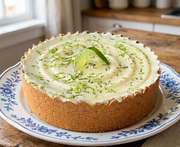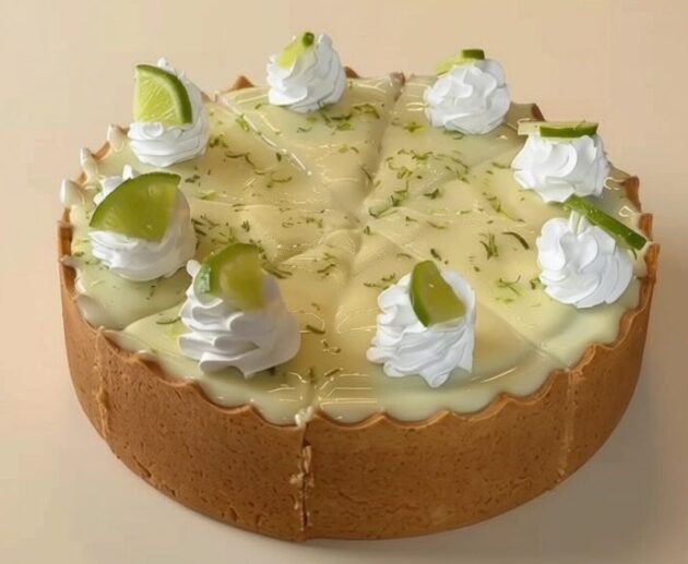 Uma torta de limão com recheio cremoso assado, base fina e cobertura simples de limão,