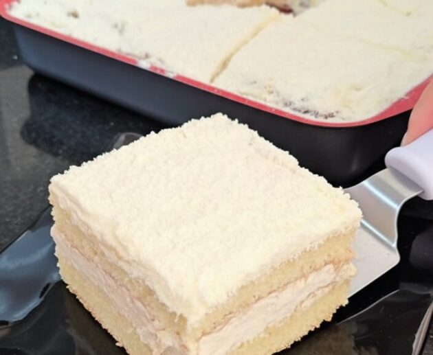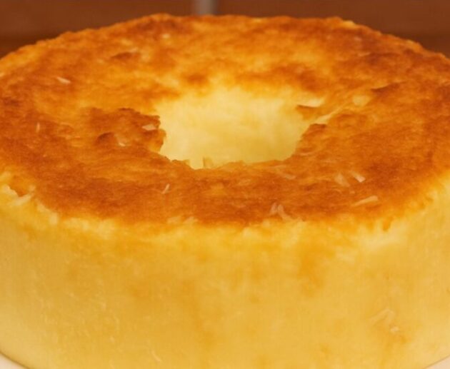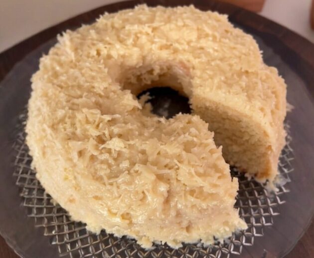 Bolo cremoso e úmido, feito com leite de coco, leite condensado e amido de milho.
